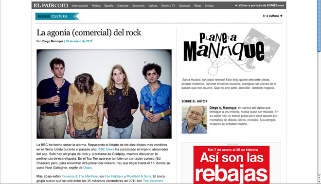 Buena noticia: Diego A. Manrique ha estrenado blog, «Planeta Manrique», en “El País”. “¡Tanta música, tan poco tiempo! Este blog quiere ofrecerte pistas, aclarar misterios, iluminar rincones oscuros, averiguar las claves de la pasión que nos mueve. Que es arte pero, atención, también negocio”, esta es la declaración de principios de “Planeta Manrique”. Desde aquí puedes acceder al blog de Diego A. Manrique. Ya lo sabes: ¡de consulta obligada!
