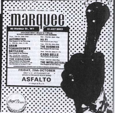 El grupo madrileño Asfalto actúa en el Marquee londinense, uno de los templos del rock en la ciudad, y por donde han pasado todos los grandes grupos británicos. Es la primera vez que una banda española toca allí. Asfalto estaba en aquellos días grabando en Londres su segundo elepé, “Al otro lado”.