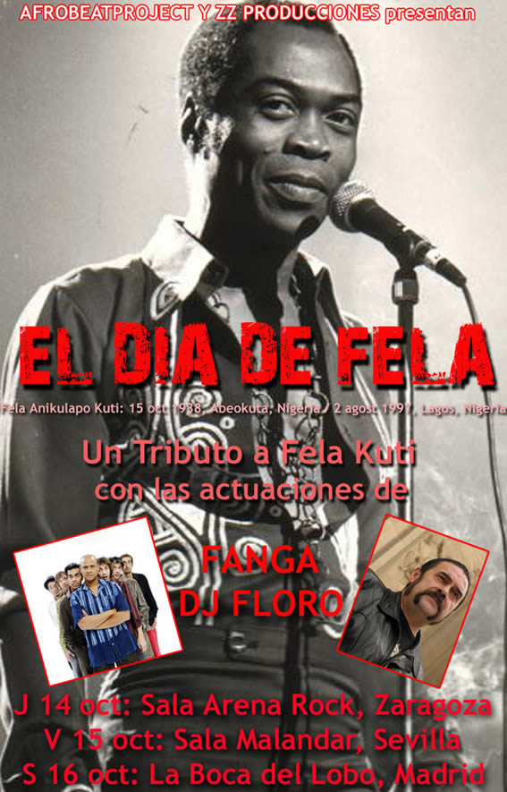 Este octubre, Fanga, desde Montpelier (Francia), y Dj Floro, desde Madrid, harán de maestros de ceremonia de “El Día de Fela Tour” que recorrerá Zaragoza (Arena Rock, jueves 14), Sevilla (Malandar, viernes 15) y Madrid (La Boca del Lobo, sábado 16).
