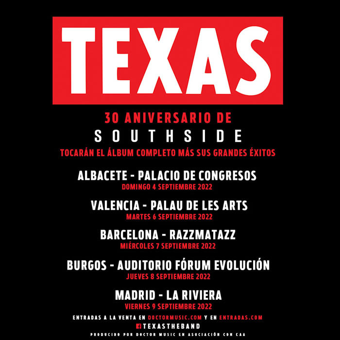 Texas visitará de nuevo España en septiembre con la gira conmemorativa del 30 aniversario de su álbum de debut, Southside. La banda de Sharleen Spiteri actuará el día 4 de septiembre en el Palacio de Congresos de Albacete, el 6 en el Palau de les Arts de Valencia, el 7 en la Sala Razzmatazz de Barcelona, el 8 en el Auditorio Fórum Evolución de Burgos y el 9 en la sala La Riviera de Madrid.