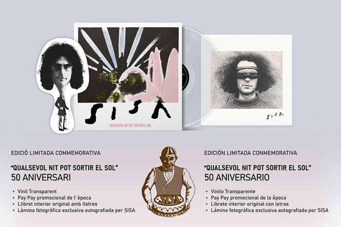 Qualsevol nit pot sortir el sol, de Sisa, cumple 50 años en 2025. Para celebrar el aniversario, se ha preparado una reedición especial en formato de vinilo, en edición limitada de 250 unidades, fabricada en vinilo transparente y remasterizada, que incluye una lámina fotográfica exclusiva firmada por Jaume Sisa, un pay-pay promocional de la época y el libreto interior con los textos originales. Satélite K lo pondrá a la venta el 28 de febrero.